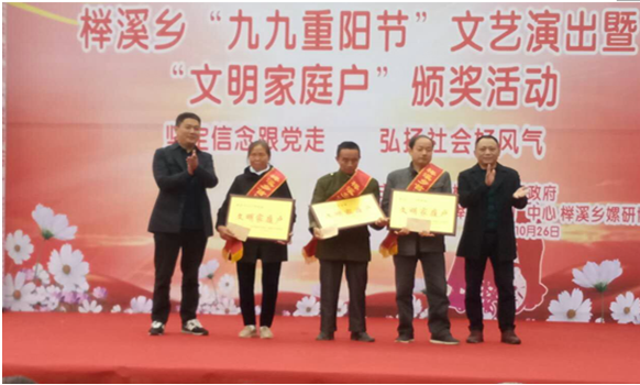 日前,榉溪乡党委政府以社会主义核心价值体系为指导,以思想道德建设为重点,以提高家庭成员素质为目标,在广大家庭中开展“文明家庭户”评选活动,并于26日开展了“九九重阳节”文艺演出暨“文明家庭户”颁奖活动。